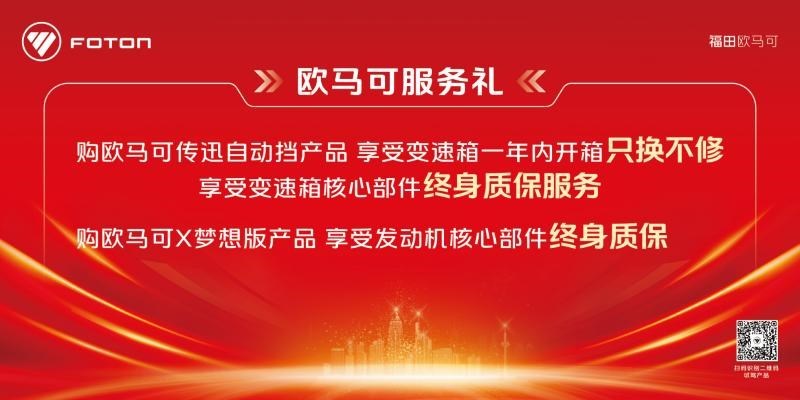 在服务礼方面,欧马可也给足了惊喜。即日起至6月30日,欧马可自动挡产品1年内变速箱只换不修,7大部件享受终身质保;此外,还有福康发动机保养、欧康4年或20万公里发动机基础保养及动力电池8年60万公里超长质保等多种服务礼,数量有限,先到先得。此外,更有系列暖心服务、尊享预见性智能服务,以优质服务为用户高效畅行保驾护航。